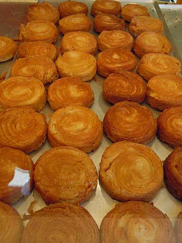 But the most famous Breton pastry is kouign-amann (pronounced queen-ah-MAHN), which just means “butter cake.” This classic Breton sweet is much like my great aunt’s irresistible cinnamon rolls—layers of yeast dough folded around plenty of butter, cinnamon and sugar, cut into large rounds, and pressed into muffin tins. But the Breton recipe differs from hers in leaving out the cinnamon, adding salt and going a step further to heavily butter and sugar those muffin tins. When the kouign-amann bakes, sugar syrup forms between the layers of dough, and a crunchy, chewy, caramelized shell forms on the outside. Tasting these warm, buttery, caramely rolls, fresh from the oven, is reason enough to travel to Brittany.