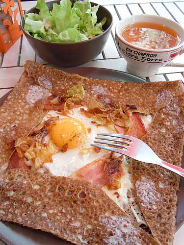 Crêpes and galettes are another favorite food in Brittany, sold at street stalls in every town, featured at festivals, and served in restaurants, some of which specialize in these big flat pancakes. Dainty crêpes are made from a thin batter of wheat flour, milk, and eggs, cooked on a large griddle. Usually sprinkled with sugar or slathered with jam, caramel spread, chocolate sauce or sweetened chestnut purée, the crêpes are then folded into quarters for serving. Galettes, which are slightly thicker, are made with a buckwheat-flour batter, cooked like crêpes on a griddle, and often garnished with sliced ham, fried eggs, shredded cheese, browned onions, or other savory ingredients. The classic drink with crêpes and galettes is a cup or ceramic bowl of cold Breton cider, the famous fermented apple juice of this region, in your choice of dry, semi-dry, or sweet.
