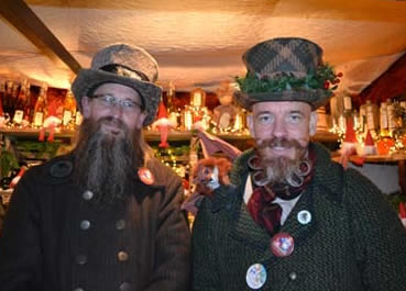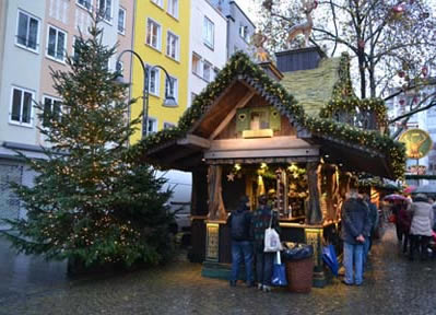 A few blocks away in the Altstadt and Heumarkt was an older and much larger Christmas Market called the “Heimat der Heinzel” or Home of the Elves. These were little creatures from a Cologne legend who used to do all the housework until they were annoyed by an inquisitive housewife, and disappeared. I loved this market. Aisles were arranged by theme, and the large wooden huts had Old World, wood-carved details, thick green garlands and costumed vendors. Little “Heinzelmännchen” rode in gondolas above an expansive ice rink. Each souvenir mug of Glühwein (the traditional hot mulled wine so popular at the Christmas Markets) had a different elf pictured on one side, and his particular work specialty described in verse on the other. Cologne boasted three additional smaller markets, but time was too short to visit all of them on this trip.