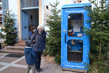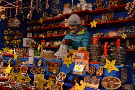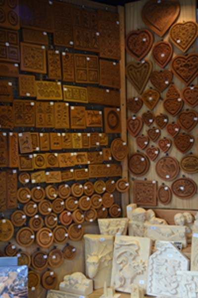 By noon the next day we docked in Mannheim and could choose a bus excursion to Heidelberg or to Speyer. Having visited Heidelberg several times already, we chose to see the 2,000-year-old Imperial city of Speyer. Here the Christmas Market extended down Maximilianstrasse from the UNESCO World Heritage Speyer Cathedral, the largest Romanesque cathedral in the world. Though smaller than the Cologne Christmas Markets, Speyer’s market had all the requisite comfort foods: Glühwein, grilled sausages, roasted almonds, and even waffles, potato soup and dumplings. Vendors offered wood handicrafts, colorful candles, jewelry, scarves, kitchen gadgets and unique cookie cutters. Especially for children were an ice rink, kiddie car rides and a telephone booth with direct access to the Christkind in Heaven!