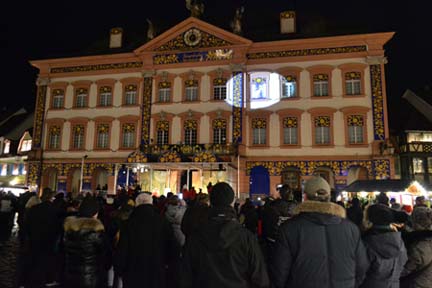 Gengenbach boasts the world’s largest Advent calendar in its neo-classical town hall, where each night one of its 24 windows is opened to reveal a picture by a famous artist. This year’s calendar featured paintings by Andy Warhol. We arrived just in time for the first night’s opening ceremony: a narrated short skit performed by children from the town. After browsing through the market’s matching vendor huts, with hot Glühwein in a mug depicting the town hall Advent calendar, we returned to the ship to be delightfully entertained by a French cabaret singer and her accordion accompanist.