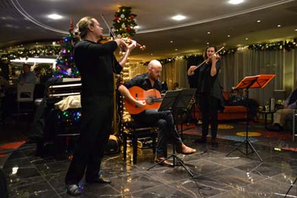 The AmaKristina set sail from Amsterdam in the afternoon, and I had time to explore the ship’s main lounge and bar, massage and hair salon, fitness room, gift shop, and even a heated pool and giant chess set on the sun deck. A cruise overview presented by our cruise director, plus Christmas tree decorating and an evening classical music performance by the three talented string players known as “La Strada” kept passengers entertained. The cruise ships cleverly bring nightly entertainment on and off the ship when stopped at the locks on the river.