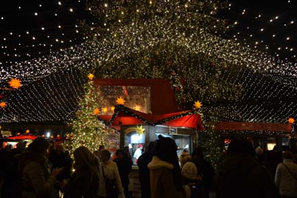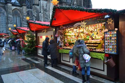 After cruising all morning, we docked in Cologne, Germany, where shuttle buses brought us to our first Christmas Market in Cathedral Square. Although the earliest Christmas Markets in Germany date from the late Middle Ages, the one in the shadow of Cologne’s impressive Cathedral is a relative newcomer, opening in 1995. Under a dazzling canopy of thousands of tiny lights, 150 vendor huts with bright red awnings and brilliant multi-faceted stars displayed handicrafts, comfort foods, gifts of all types, decorations, wooden toys and much more.
