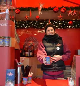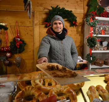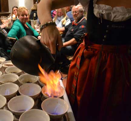 After a gourmet lunch of traditional German specialties, we docked in Rüdesheim, where the “Christmas Market of the Nations” wound up and down the narrow streets of this wine town of about 7,000 citizens. Vendors from France sold mushrooms, lavender and cheese, Tunesia vendors brought wares made of olive wood, smoked salmon came from Norway, furs came from Finland and even the United States was represented with a local vendor offering homemade cookies, Dr. Pepper, Fanta, marshmallows, and Hershey’s chocolate. Christmas choir music piped throughout the market added to the festive atmosphere as shoppers strolled past inviting vendor stalls and village shops. A new discovery at this market was hot mulled Glühbier from Belgium.