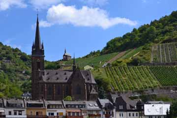 The town of Oberwesel, below Schoenburg Castle, still has many fortification walls and towers still standing. When the river water is low, travelers can see the “rocks of the seven virgins.” Legend has it that a lord with seven sons wanted to arrange marriages for them. The seven chosen virgins didn’t want to marry, and threw themselves into the Rhine, where, because they were so hardhearted, they turned to stone.