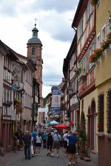 Miltenberg was built against a hill at a curve in the river, a perfect place to collect tolls for the archbishop of Mainz. Many half-timbered houses are still preserved because the people here were too poor to tear them down and rebuild. If a floor sagged and sank, it was filled with sand and covered with another floor. In some recently renovated buildings, 30 centimeters of sand/wood layers were discovered beneath the floor. The original red “paint” on the houses was a mixture containing, among other things, oxblood and cattle dung, which provided the desired red color and also killed worms that might live in the wood. A unique naturally cool icehouse is located in the hill at the rear of the town.