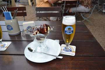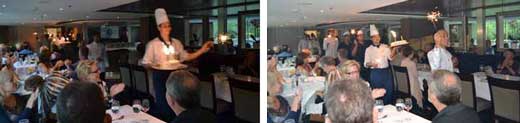 Another luxury on a cruise such as this is the excellent cuisine. The sumptuous breakfast buffet included breads, pastries and cereals, fruits, eggs, potatoes, sausages and bacon, and made-to-order entrees. The full lunch buffet served each day in the main dining room offered soups, salads, choice of main course and desserts. A lighter lunch option was also available in the lounge one deck above. Five-course dinners included an appetizer, choice of soups, salad, choice of meat, fish or vegetarian main course, and several dessert options. The well-trained staff served red, rose, or white wine or beer upon request.