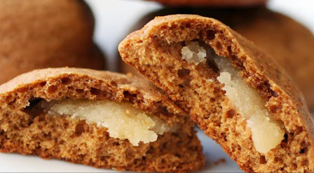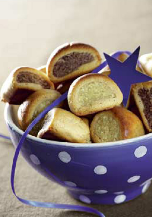 8 x 8″). Halve the squares lengthwise. Moisten edges with water. Halve the marzipan. Form 2 rolls (each about 12″ long, by 3/4″ diameter). Place 1 roll on the long side of the dough, form into a roll, cover and store in a cool place for 1 hour. Form a second roll. Cut the rolls diagonally into 1″ wide trapeze-shaped pieces. Place the Biberli on a baking sheet lined with parchment paper. Glaze with heavy cream.