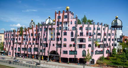 This architectural retail/apartment building has been the subject of much discussion since it was constructed in 2005. It was the last building Hundertwasser designed before his death. The artist said the building was an “oasis for humanity and nature within a sea of rational houses” at the heart of the “concrete desert” of Magdeburg.