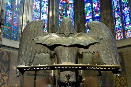 The design of the west side was truly groundbreaking. It has the largest exterior surface of any church in the world, said to be around 23,000 square feet, and is flanked by two huge towers, each rising to a height of 515 feet. The cathedral houses a wealth of important art treasures, including colorful stained glass windows that bathe the church interior in a mysterious light; the Ottonian Gero Cross (around 980 AD), the oldest large-scale sculpture in the western world; the shrine housing the relics of the Three Kings (1190-1225), an outstanding example of Rhenish goldwork; the altar of the patron saints of Cologne by Stefan Lochner (around 1450), a masterpiece of the Cologne school.
