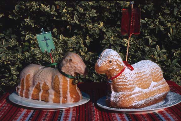 The simplest lamb breads and cakes are merely dusted with a coating of confectioners’ sugar or drizzled with a light glaze of sugar icing. More elaborate cakes are covered with fluffy white frosting, sometimes garnished with shredded coconut, or spread with chocolate icing decorated with white icing swirls. The eyes are made from raisins, whole cloves, or coffee beans, and a small silk ribbon, often with a tiny bell attached, is tied around the lamb’s neck. Many of these lambs also hold a colored foil banner bearing the emblem of a lamb or a cross—recalling similar banners carried by Christian crusaders to the Holy Land a thousand years ago.