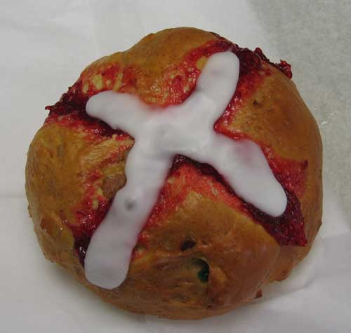 Hot-cross buns are the most typical Easter bread in Great Britain. Baked on Good Friday, these round, slightly sweet buns often have chopped fruit peel and currants, raisins or sultanas in the dough. A cross is cut into the top of each bun before baking, or a strip of dough is used to make the form of a cross on top, to keep away evil on this sad day of remembering Christ’s crucifixion.
