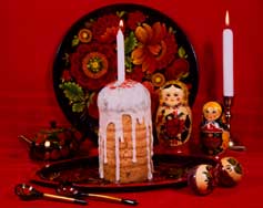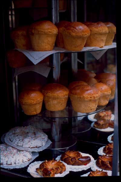Since Easter is a springtime celebration of new life, it’s not surprising that many traditional Easter breads are made in the form of ancient fertility symbols. The most graphic of these are the tall, cylindrical breads with a puffy dome on top, whose phallic symbolism is unmistakable. Festive breads of this shape are made in both France and Italy, but the most famous is Russia’s kulich, a saffron-scented yeast bread flavored with raisins, almonds and candied fruit peel. The domes are frosted with white icing that dribbles down the sides in a further reinforcement of the fertility image. The kulichi can also be decorated with colored sugar sprinkles or candied fruits, and a long thin red candle is usually stuck into the top of the dome. On Easter, Russian Orthodox churches are often filled with these special breads, their candles lighted, awaiting blessing by the priest.