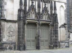 The Castle Church, with an 288-foot-high tower, was once the magnificent castle of the electors of Saxony, built between 1489 and 1525 for Frederick the Wise. It also became the university church, and it was here that Martin Luther nailed his 95 Theses to the door. Today a black bronze door (installed in 1858) has replaced the original one. The door commemorates October 31, 1517 when Luther nailed his theses “on the power of indulgences” to the door.