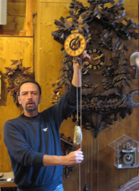 At least two pinecone-shaped weights hang on chains beneath the clock: one to operate the cuckoo and one for the cog-driven timing mechanism. If the clock has a third weight, it has been fitted with a music box, which plays after the call of the cuckoo. The clocks are “wound” by pulling the chains to raise the weights to their highest position. Clocks with large pinecone weights are wound once a week; clocks with small pinecones are wound every day. While my aunt had to still the oak leaf pendulum every night to stop the clock and quiet the cuckoo, many clocks now have a switch that turns off the cuckoo and music, but allows the clock to keep running.