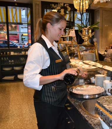 The staff is attentive to special requests and diets, and they make notes of special needs for the guest’s next stay. I was told that if I came back next year for breakfast, the staff would remember what my breakfast preferences were. Breakfast is served in a room on the mezzanine, with pleasant surroundings and a cheerful waitstaff.