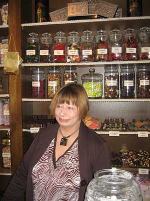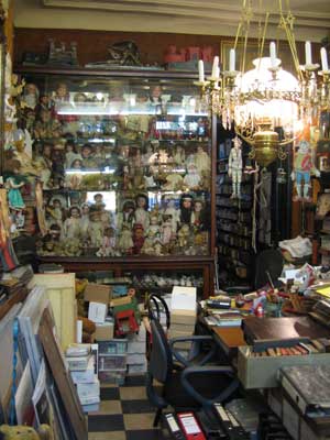 Her very small, quaint shop is packed with imagery in the old kitchen tins, the religious paintings, the thousands of postcards, the picture albums from as early as 1886, the old manufacturer catalogs, and the posters, dolls, toys and trains that pack the place.