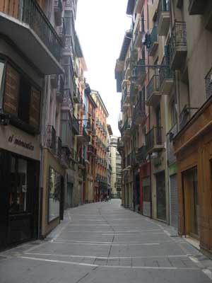 Expansion outside of the city walls didn’t begin until the end of the 19th century. Until then, growth within the walls meant not more but taller buildings, an unusual sight in Spanish cities, where 2-3 story structures are the norm. You can see these tall and colorful buildings in the old quarter along the streets that fan out from the Plaza del Castillo.