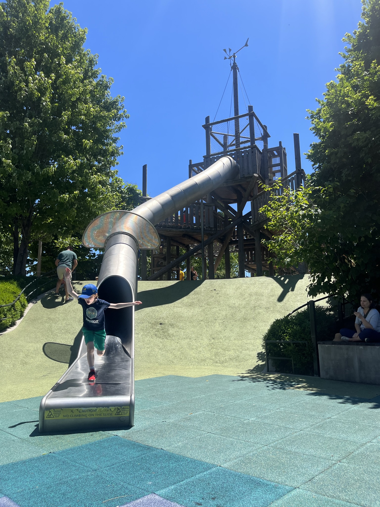 From Swissôtel to the massive Chicago Park District play area, Maggie Daley Park, is a 7-minute walk. The largest free activity is the Play Garden, a series of interconnected, imaginative play spaces integrating landscaping with the sculptures and structures. The Sea area features a large-scale ship and lighthouse tower with ladders, slides, talking tubes, and lookout scopes. The Watering Hole’s animal-themed splash pad includes a shady area with a bench for parents. A Harbor boat play zone, Enchanted Forest sensory exploration pathway, and Wave Lawn of rolling topography and sloped hills offer varied equipment and opportunities to engage all senses and stimulate imagination. Slide Crater’s giant suspension bridge slung between two towers is thrilling to run across while trying to keep your footing. Experience slides of all sizes and formations in this area (although the metal variety can be HOT in the summer sun!). Talk through tubes with others around the structure, rotate knobs to spin giant wheels, and be the lookout at the viewing scopes.
