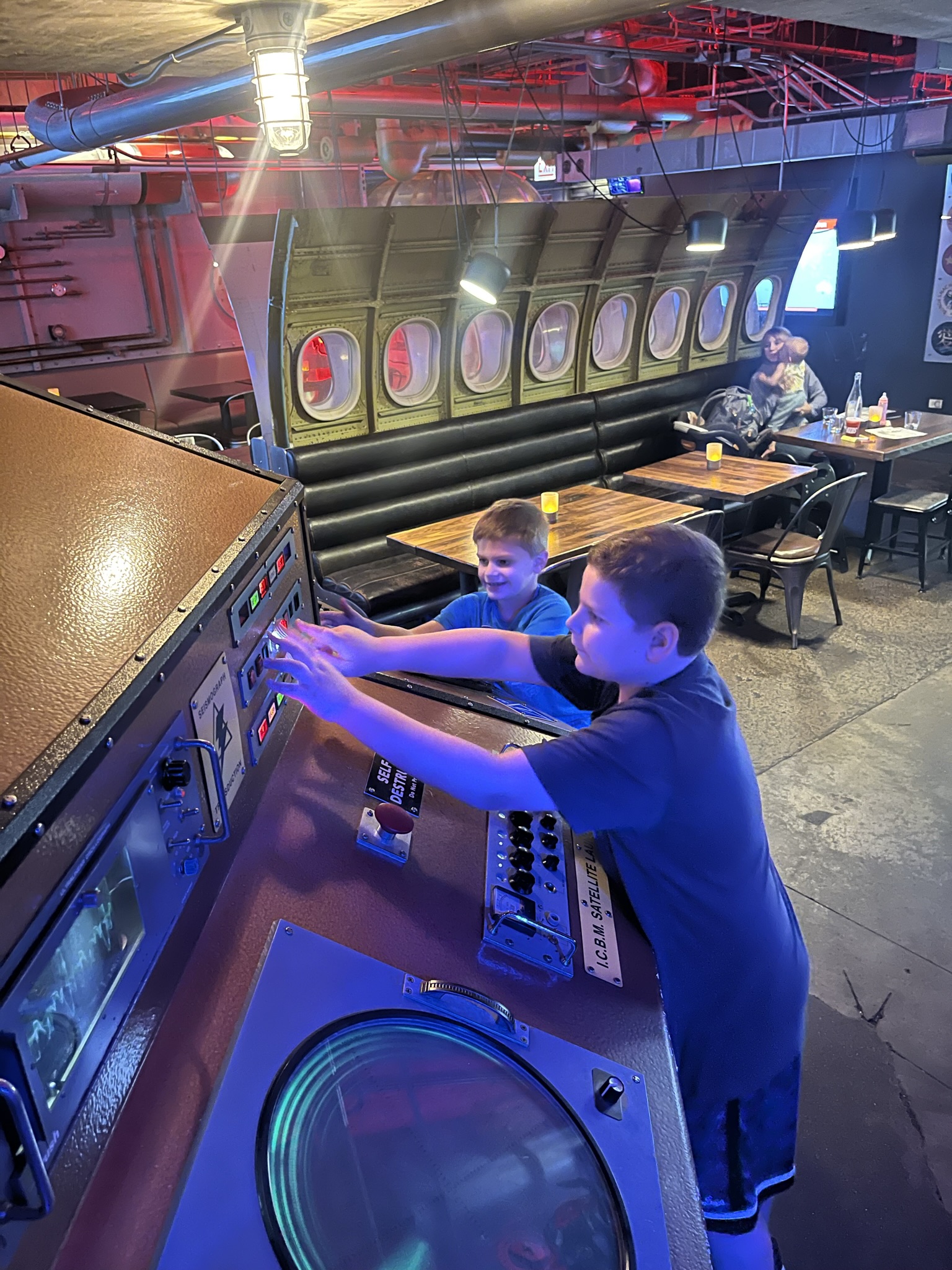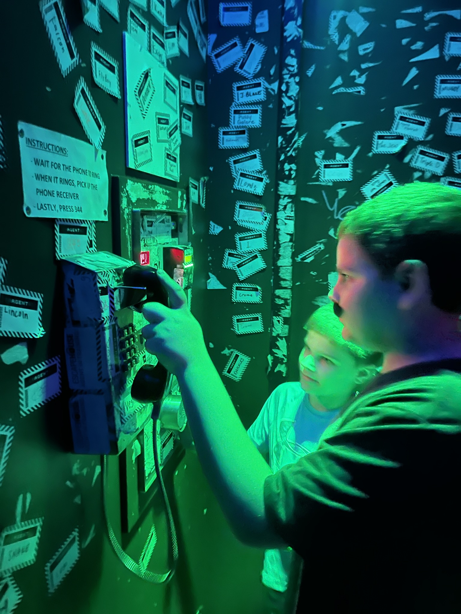 Silly surprises like one-way mirrors and alarms await in the bathrooms, and kids and adults alike can play with futuristic tech gadgets and create their own agent names. In-character waitstaff check with “Command” regarding food allergy inquiries and provide junior agents with top-secret disguises (sticky-backed fuzzy mustaches) upon request. Reasonably priced fare includes A License to Kill Mac & Cheese, “007” Layer Salad, Mission Impossible burgers, Camp Stanley Nachos, and Russian Finger Potatoes. Junior Spies can request meals like Goldfingers chicken nuggets, Carmen Cortez mac & cheese, or an Uncle Machete chopped taco salad. Make your escape by dialing a secret code in the hidden phone booth, dodge the maze of red lasers in the dark hallway, slap your agent nametag on the wall, and make your discreet exit back onto the city street.