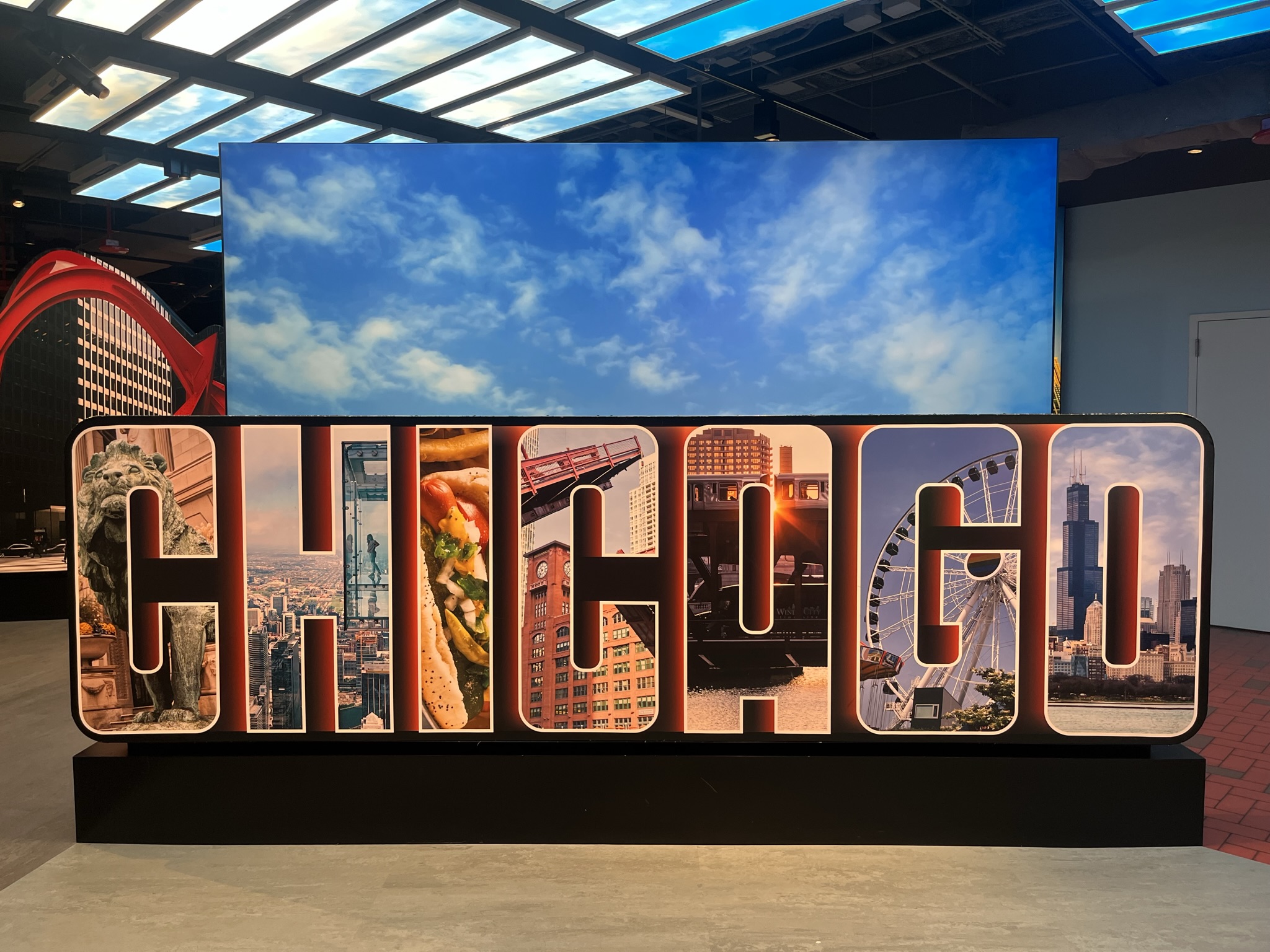 To head from dinner toward an evening at Skydeck Chicago in the Willis Tower, ride the scenic water taxi from the north side of the river at Michigan Avenue to the Ogilvie/Union Station stop, followed by a short walk, or call for a 13-minute Lyft drive. The winding, museum-tour walk to get to the elevator bank displays an artful collection of exhibitions, facts and figures about Chicago, and fantastic photo opportunities—an El simulation with vibrating seats and city scenes sliding by the window; a giant, plastic Chicago-style hot dog and deep-dish pizza to rest on; jazz, Oprah, The Second City, Wrigley Field, Cadillac Palace Theatre, and iconic city scene backdrops to pose in front of. A speedy ride in the elevator (1,600 feet per minute) shoots you up to the skyscraper’s viewing level.