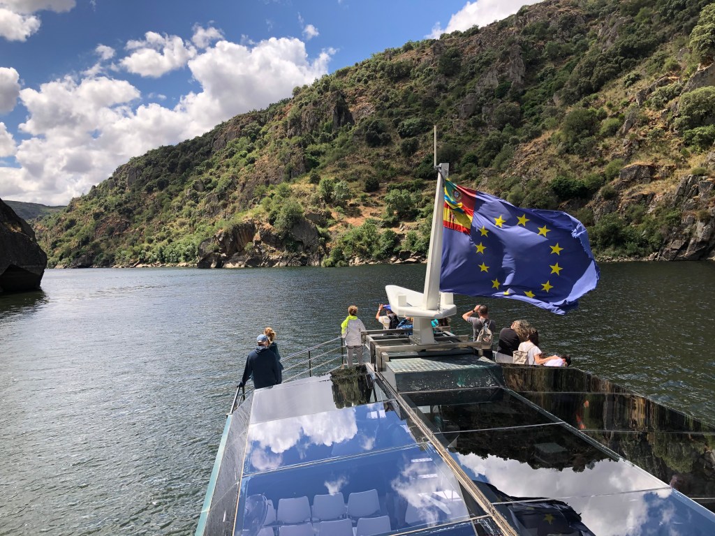 Flying the flag of the European Union, this excursion boat offers a narrated environmental cruise spotlighting the geology, flora and fauna of the Douro River Valley, a land of scenic splendor on the Spain-Portugal border.