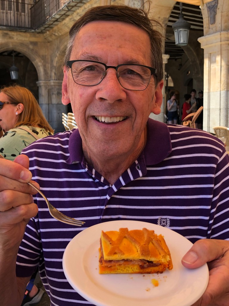 Clockwise from upper left: Relaxing and people-watching on Salamanca’s Plaza Major, one of Spain’s largest and most beautiful squares; The best views of Salamanca’s Old World skyline are from the banks of the River Tormes and its Roman bridge; The author enjoys a hornazo meat pie at a café on Salamanca’s Plaza Major; Hornazo, a meat pie with layers of pork chorizo, pork loin and ham wrapped in lattice-crusted yellow dough, is a specialty of Salamanca province; Exploring Salamanca’s Old and New Cathedrals.