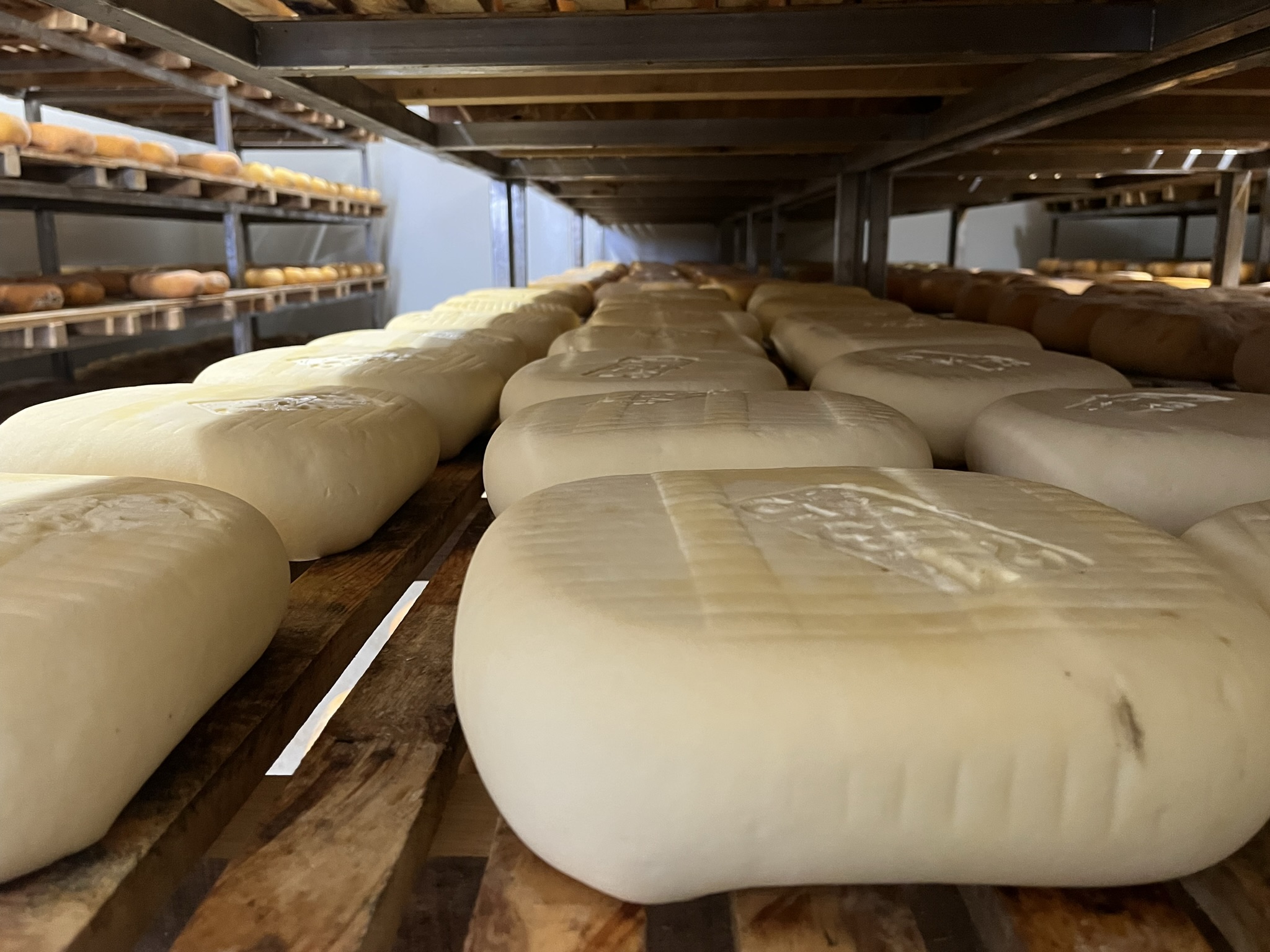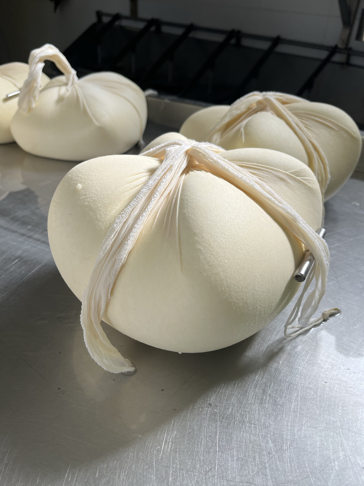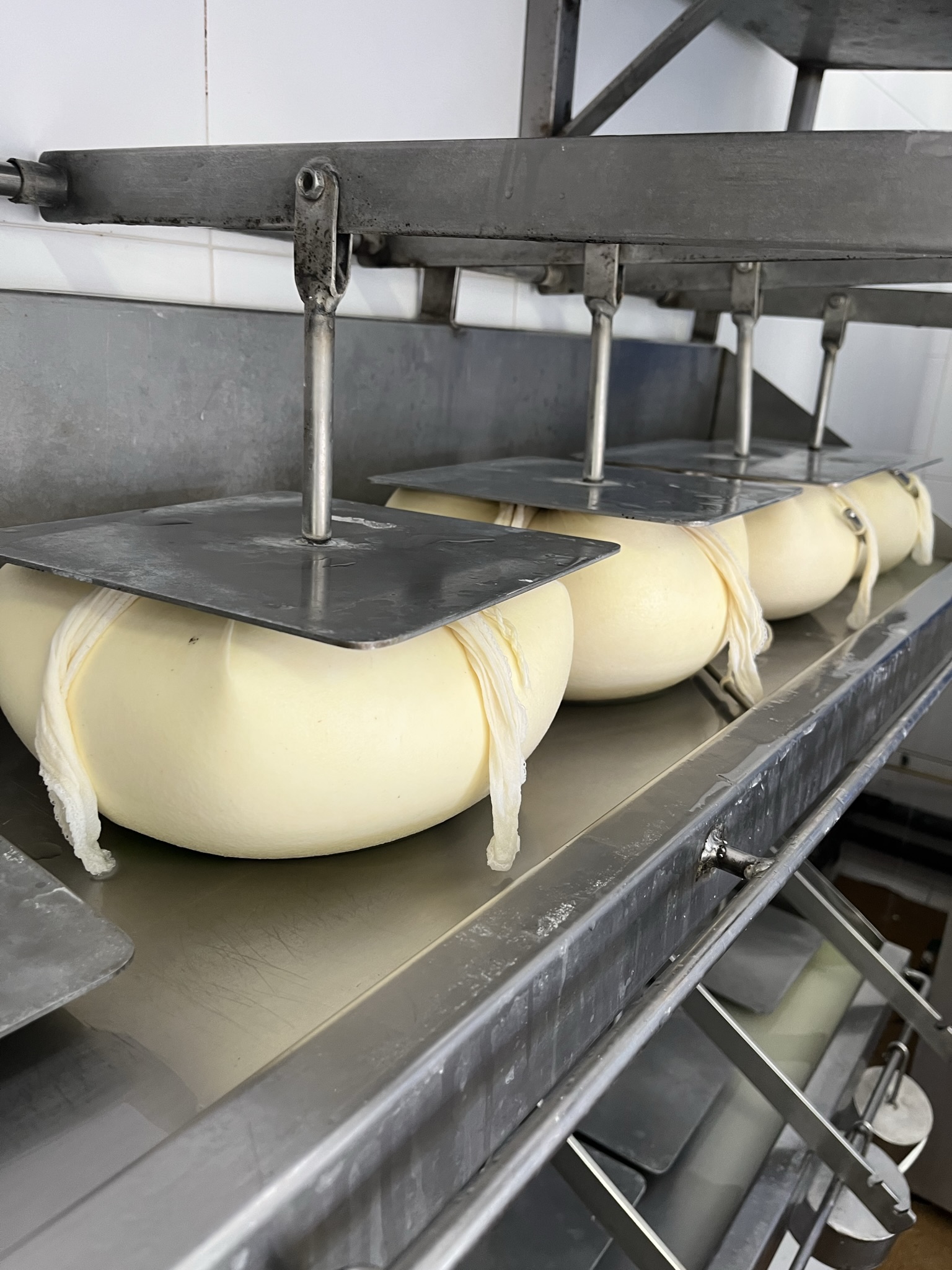 (clockwise from upper left) The unique shape of Mahón-Menorca cheese comes from the cheesecloth used during the pressing process, and fabric lines from the cloth remain visible in the rind; Son Piris cheeses are wrapped tightly in cheesecloth, which holds together the solid cheese curd while allowing for drainage of liquid whey; Wrapped cheeses are pressed to remove excess moisture; After their tightly wrapped cloths are removed, the cheese is set out to dry; Martina Fedelich of Son Piris serves the famous farm-to-table Mahón-Menorca Denomination of Origin cheese.