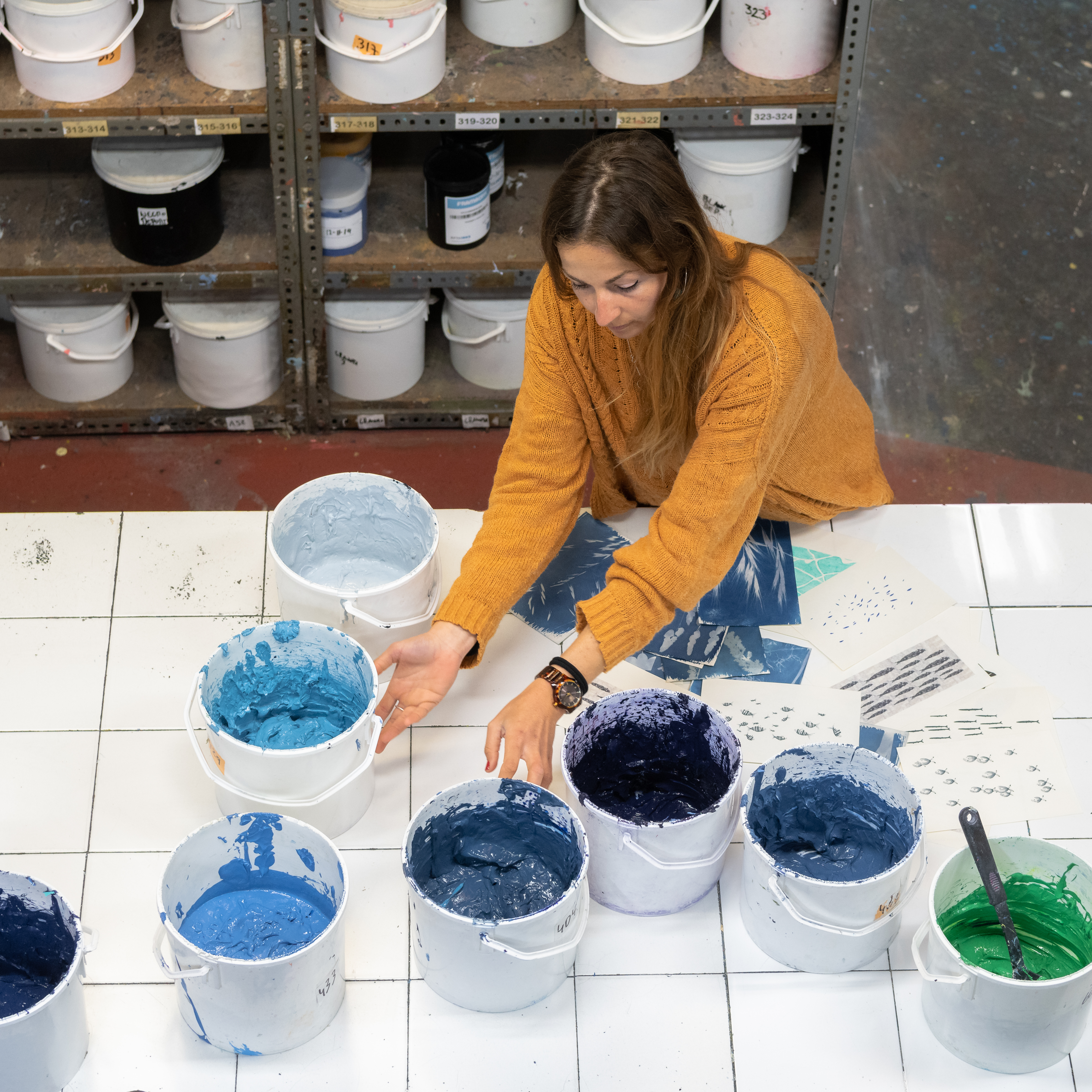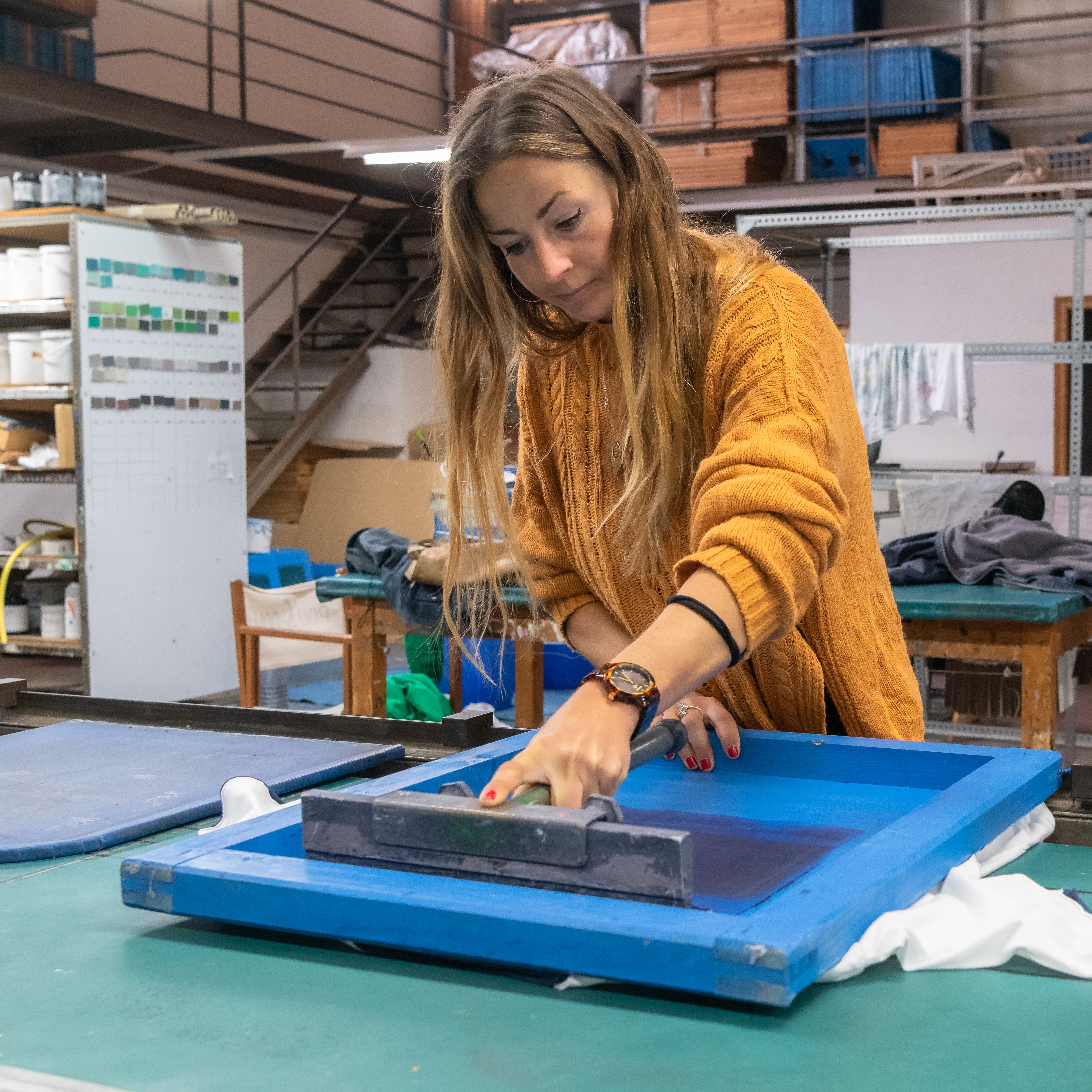 (clockwise from left) Pou Nou team members select nature-inspired artwork for clothing designs; Pou Nou colors and designs are inspired by Menorca’s flora and fauna, sea, and sky; Using a Mediterranean-inspired color palette, a Pou Nou team member tests a screen-print design.