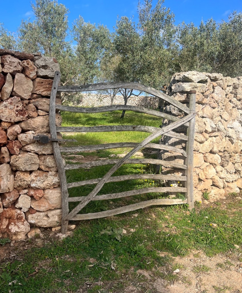(left) Unique to the island, Menorca’s navetas are pre-Talaiotic burial monuments shaped like an inverted boat and built using only large stone blocks. (middle) The island’s naturally rocky soil is gleaned to build stone walls that separate land plots. Wild olive trees with olives not suitable for harvesting are formed into farm gates using their distinctive, curvy wood. (right) Prevalent on Menorca are cement-free stacked-stone walls and sturdy gates crafted from wild olive trees.
