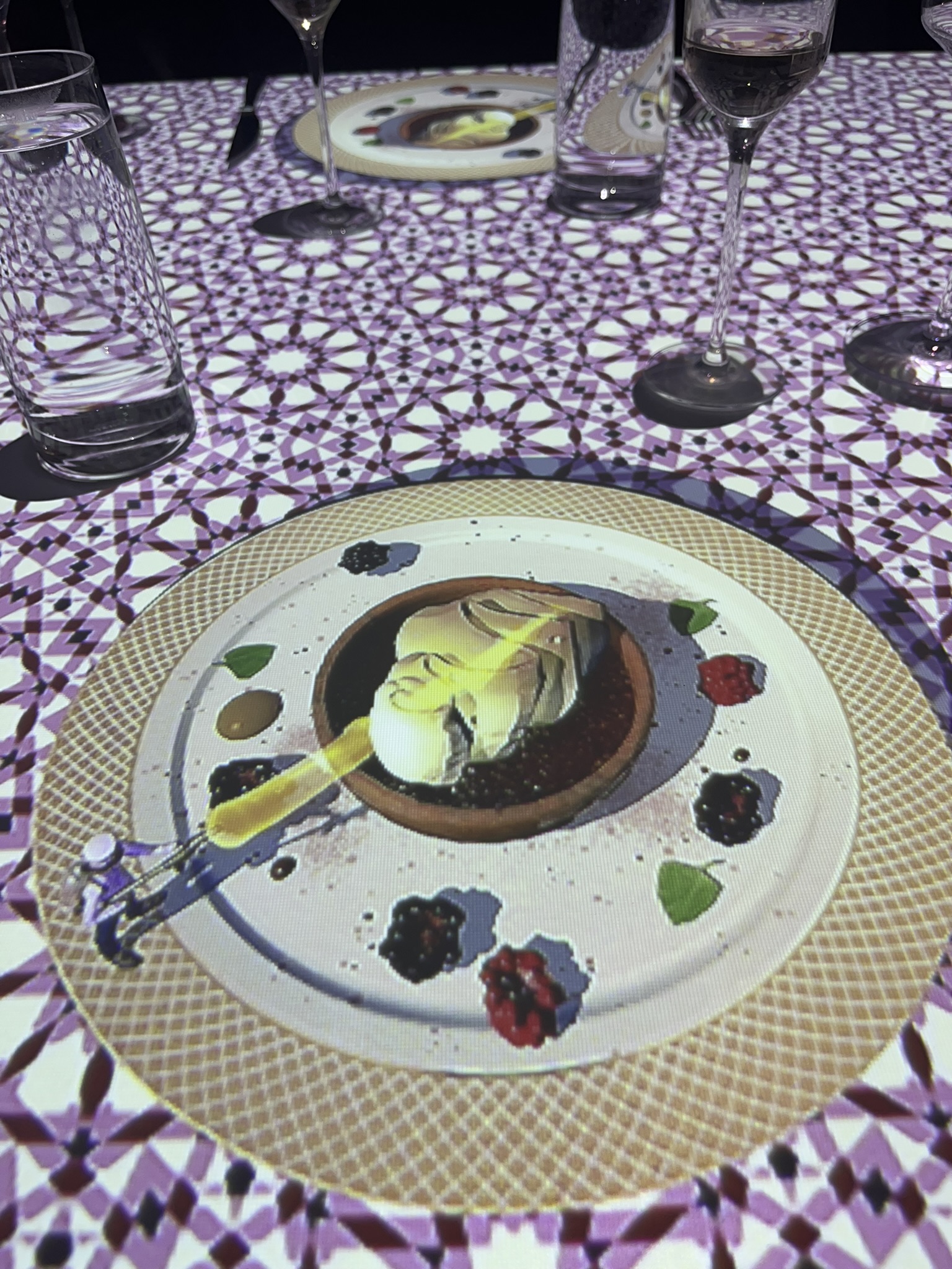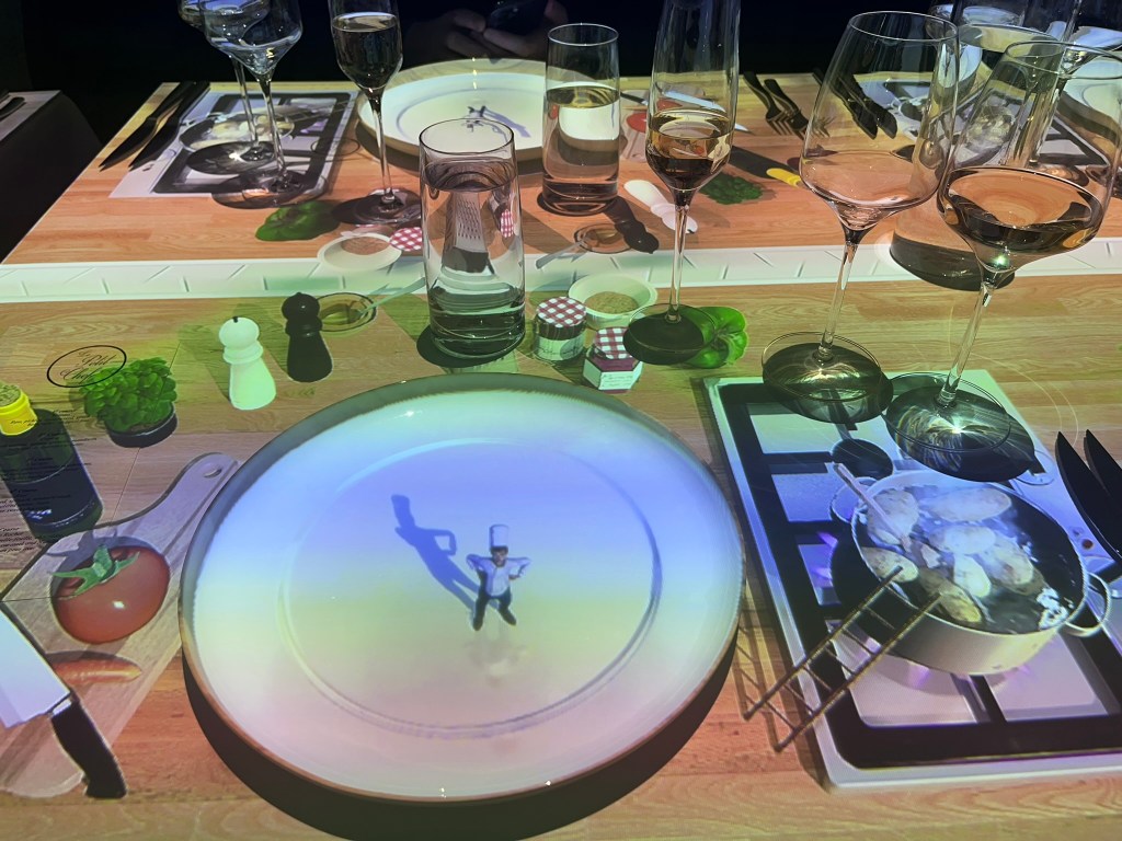 Projected from the ceiling down to the tables and plates, 3D scenes and designs bring the dining area to life, illustrating gardens, sculpted fountains, raging battles, as well as busy cooktops boiling potatoes and searing meat. Between humorous anecdotes, musical numbers featuring dancing vegetables, lessons about ingredient composition, and tips on flavor combinations, guests are served a beautifully prepared, delectable 5-course meal featuring the elements showcased.