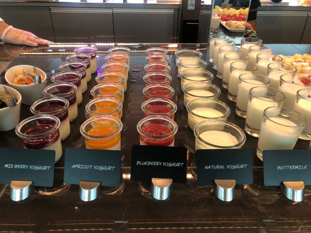 Left to right: The Scenic Opal’s daily breakfast buffet offers choices galore, including many varieties of yogurt. (Randy Mink Photo)