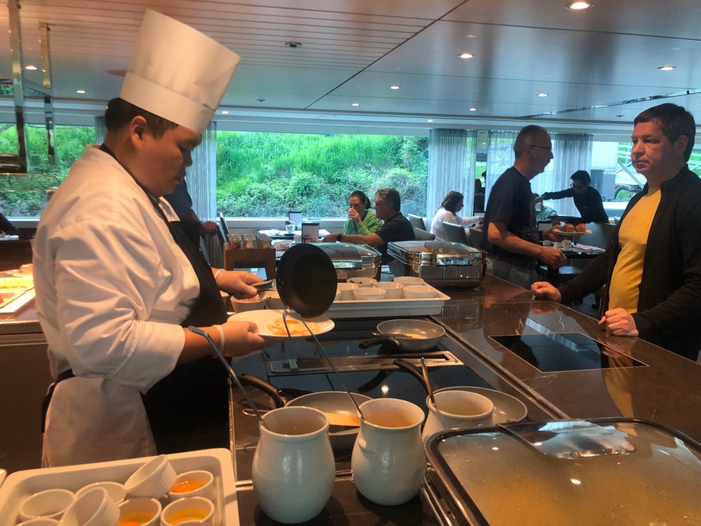 Recorded oom-pah band music lent a Munich beer hall vibe as I washed down traditional German foods with a tall glass of Erdinger Weissbier, a classic wheat brew. Dessert was Dampfnudel, a pillowy steamed dumpling filled with blueberries. Other lunch buffets usually featured at least one food representative of the region we were traveling through.