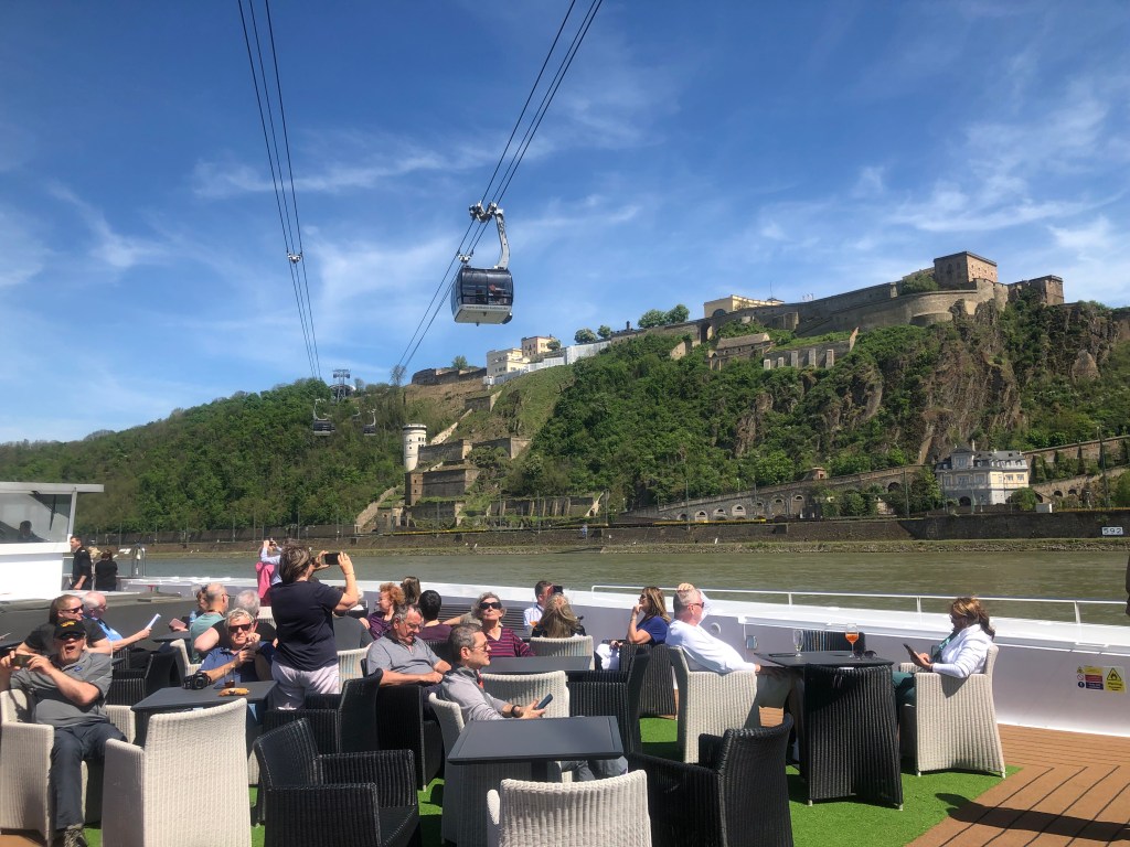 2: In the Rhine River city of Koblenz, passengers relax on the Sun Deck of the Scenic Opal as cable cars to Ehrenbreitstein Fortress pass overhead. (Randy Mink Photo)