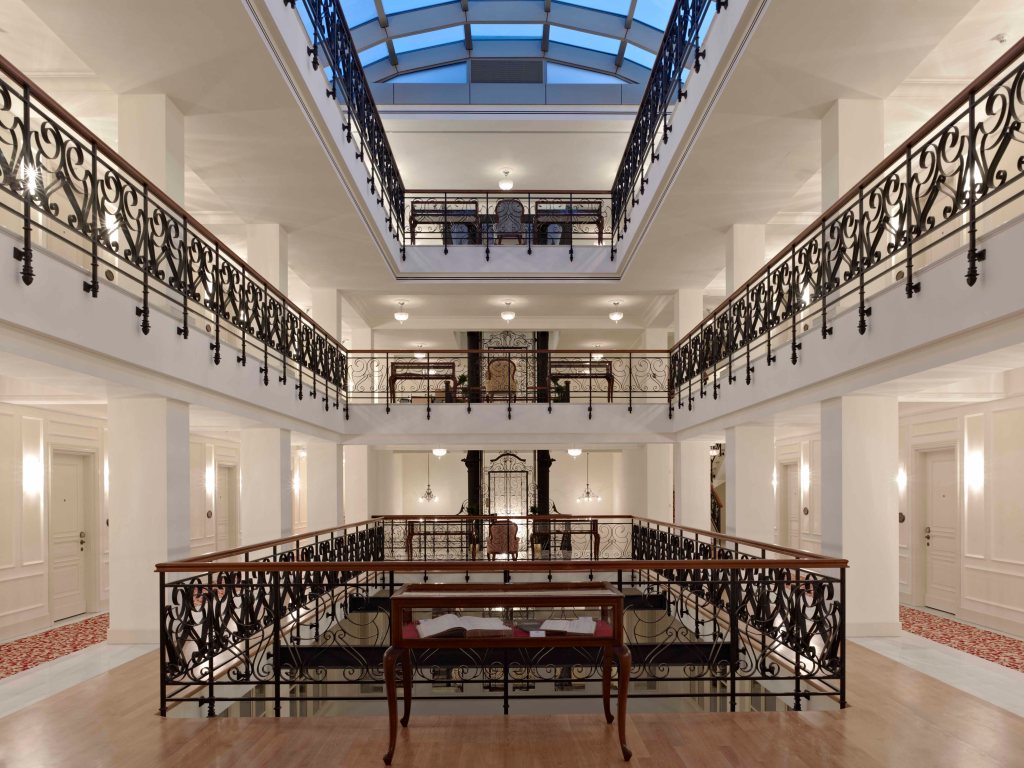 A traditional afternoon tea with piano music is served under the six skylight domes of the Kubbeli Lounge. Featuring elements of Islamic architecture, the two-story-high room is decorated in dark reds and deep plums, as is the nearby Orient Bar, another plush spot to drink in visions of a bygone era. The equally stylish Library Room seating area, complete with bookcases and antique globes, extends from the lounge and bar.