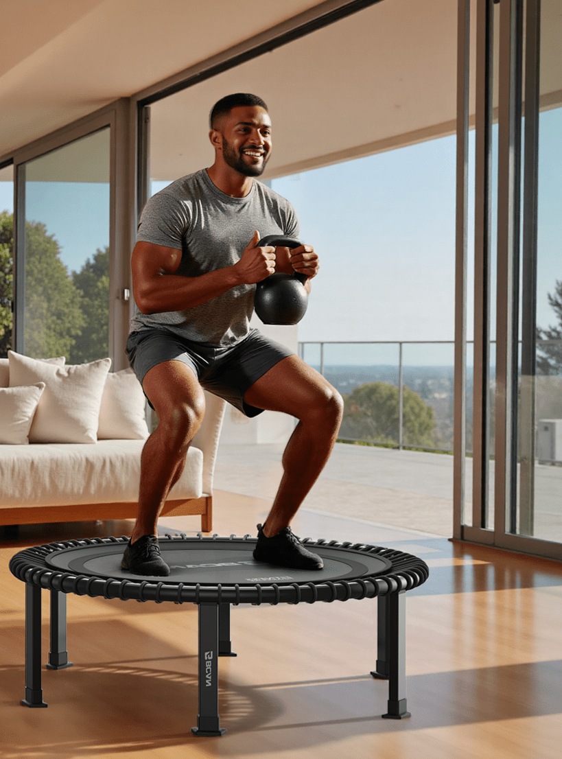 By placing this trampoline in an accessible area, household members can conveniently use it throughout the day for cardio sessions—it is truly easy to fit in a short jumping workout without feeling pressure to plan ahead or carve extra time out of the day. The trampoline accommodates a wide range of heights and weights and is much easier on the knees than running.