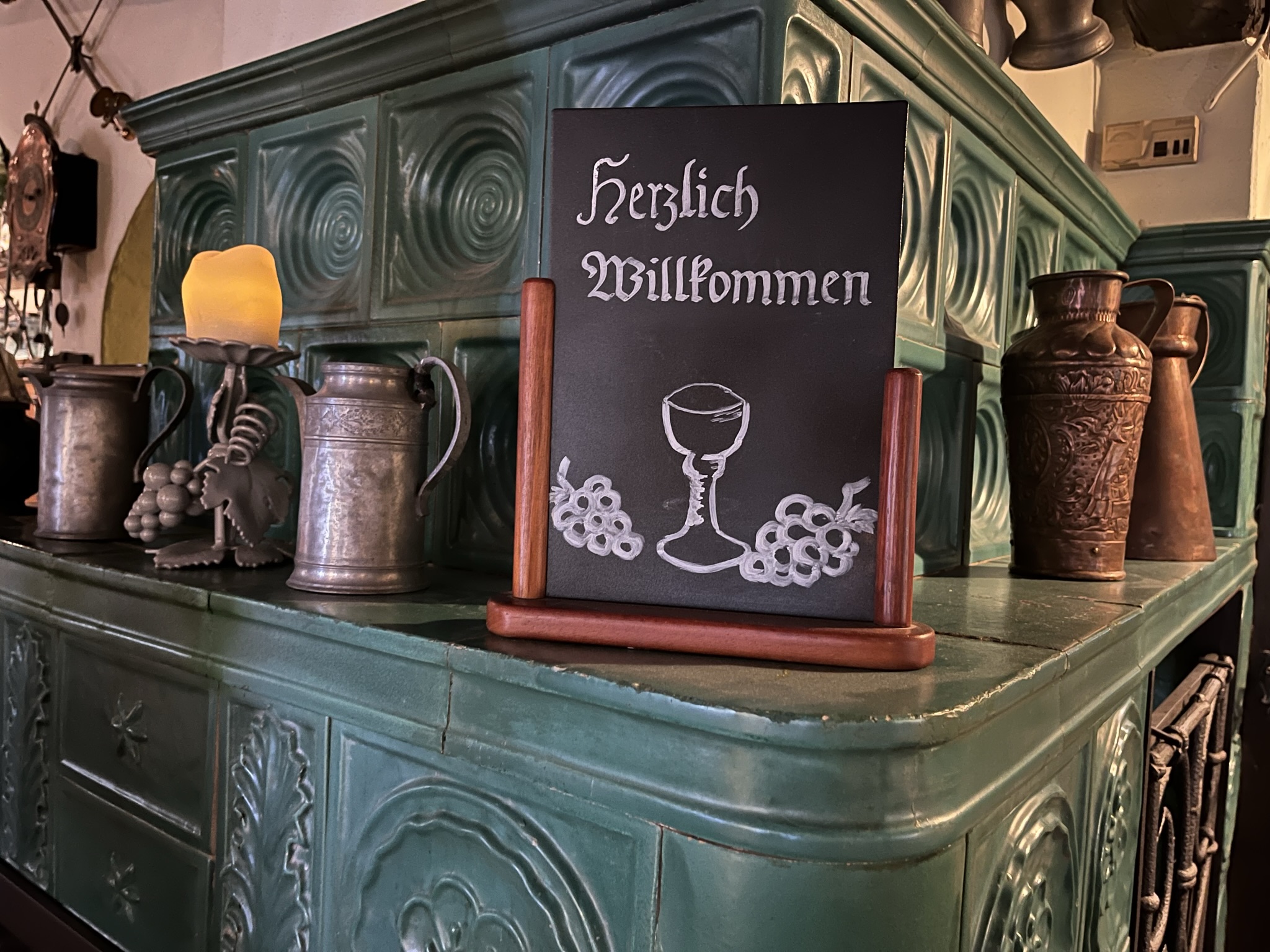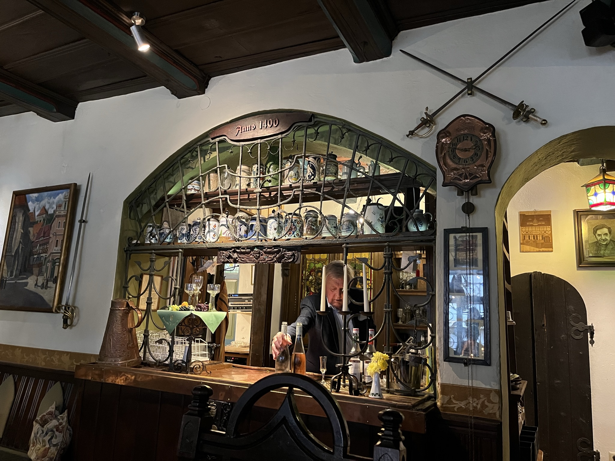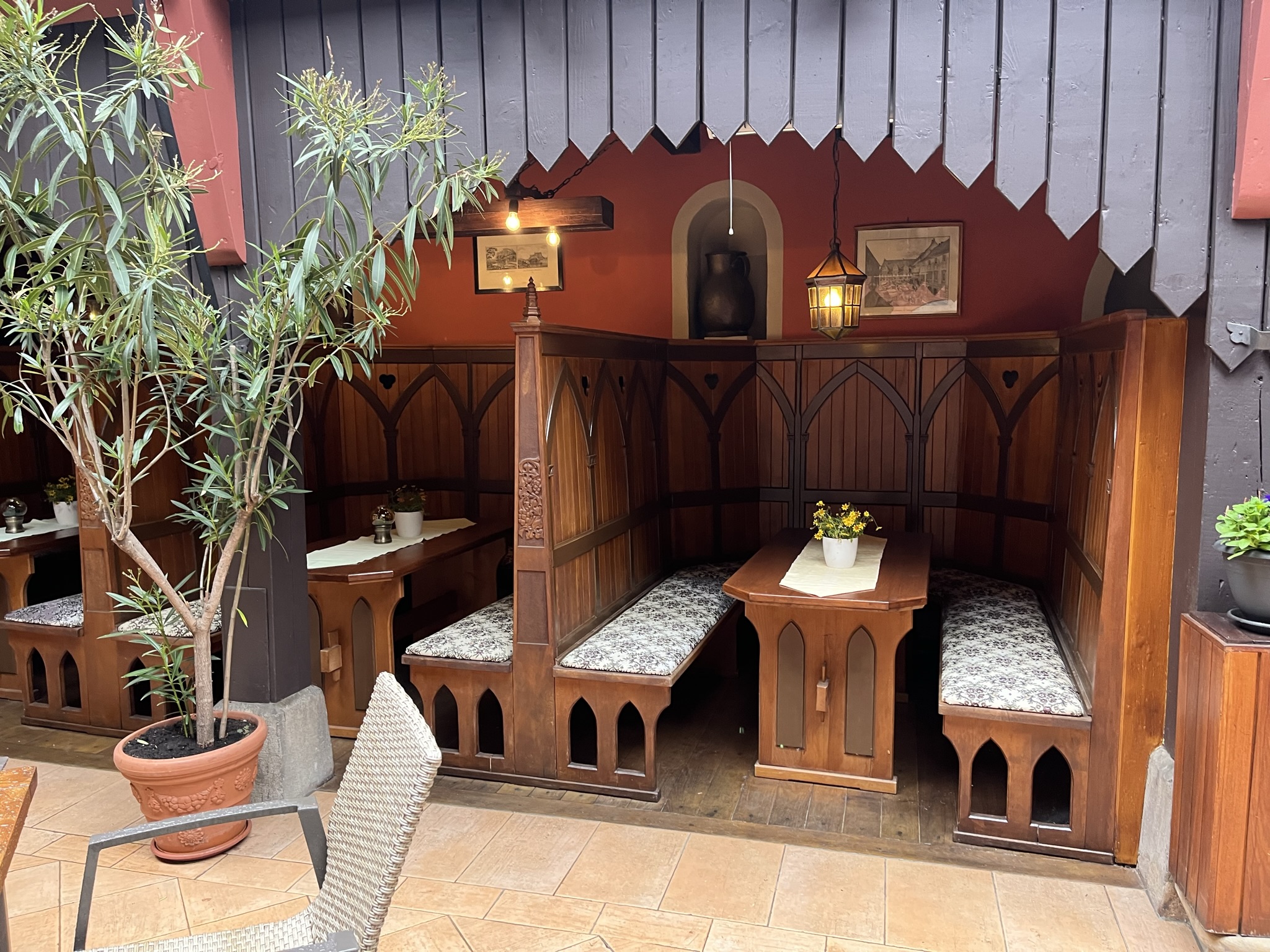 Barrel-fermented sauerkraut grown by the Wehr family in the Aischgrund region is cooked and seasoned at Zum Gulden Stern with fresh pork lard. The vegetables, horseradish, and wines served at the restaurant are all sourced from family-owned businesses in the region, and the dishes are substantial and savory. This tavern survived all the wars, likely hosted famous Middle Ages painter Albrecht Dürer, and still serves up delicious daily-prepared meat-and-vegetable soups and famous sausages. In addition to the interesting antique wall art, the colorful wooden ceiling is patched with old brightly painted cupboard panels, to cover holes made where weighty drunken guests from older days had fallen through from the upper level.