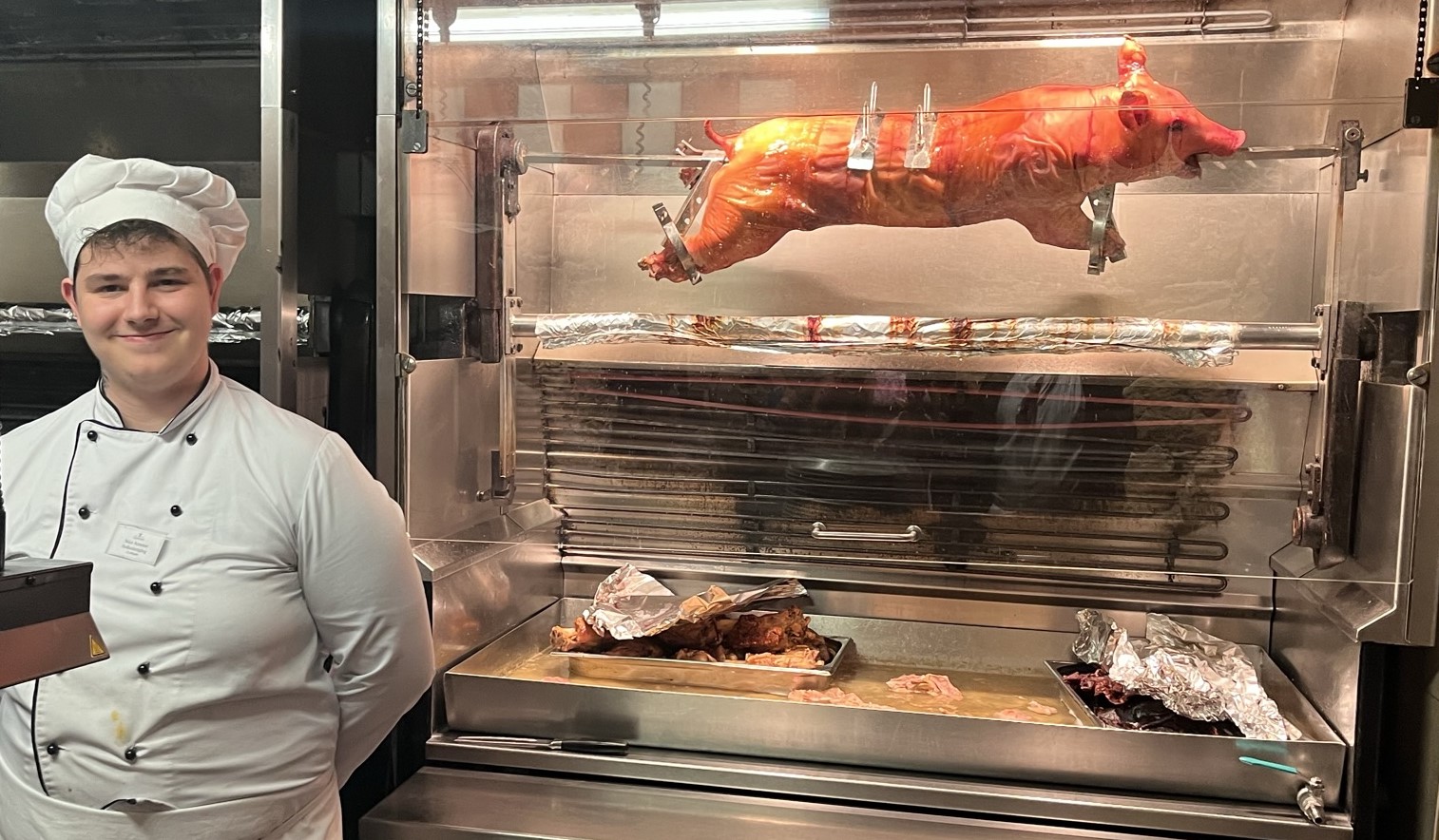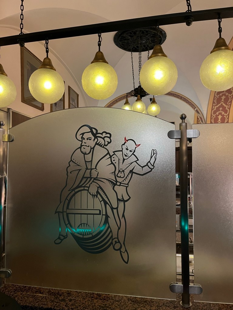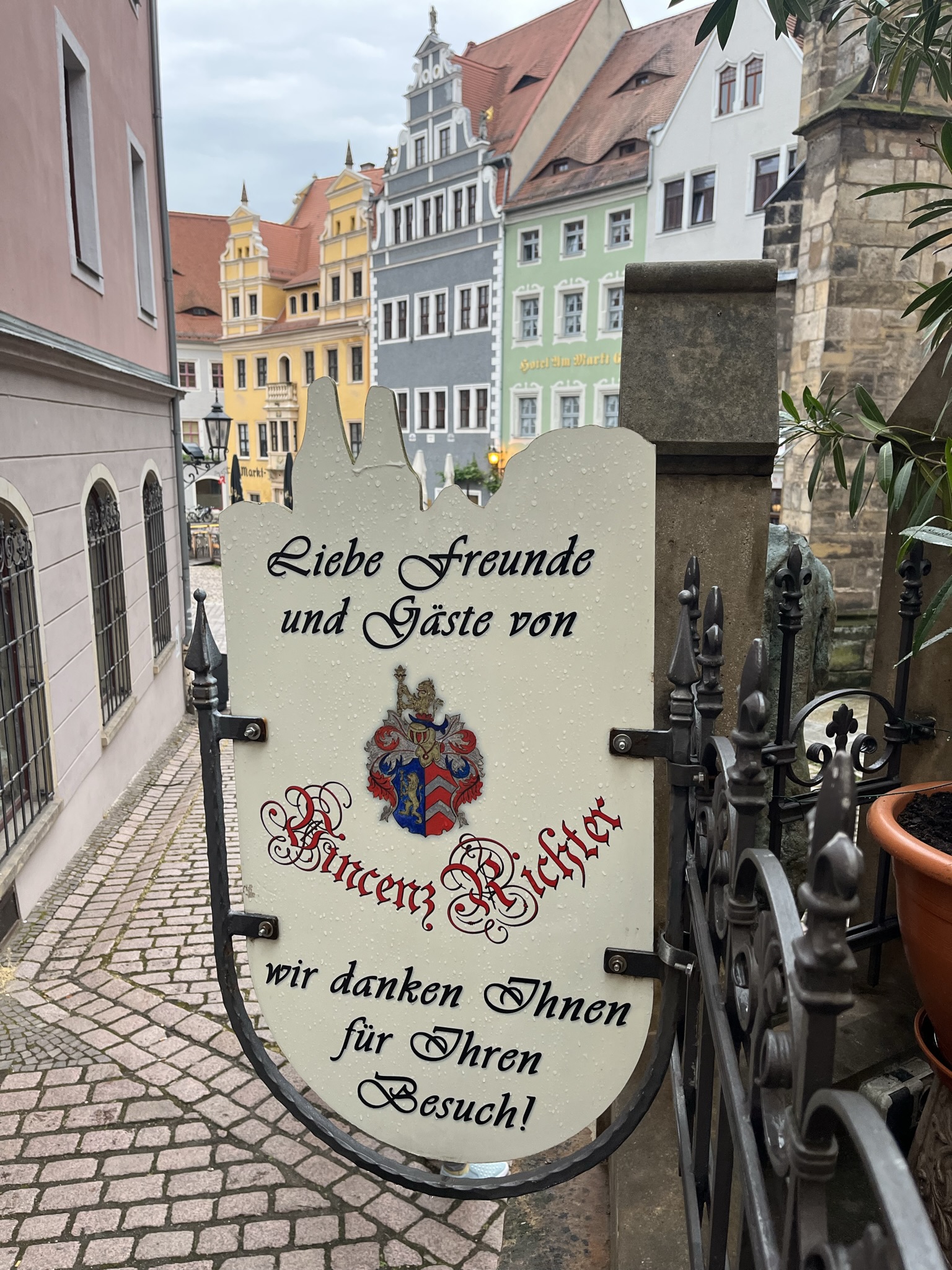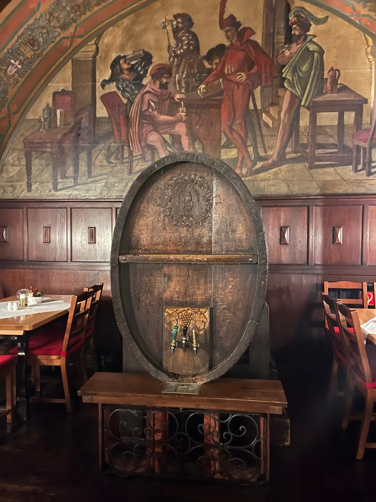 Barrel-fermented sauerkraut grown by the Wehr family in the Aischgrund region is cooked and seasoned at Zum Gulden Stern with fresh pork lard. The vegetables, horseradish, and wines served at the restaurant are all sourced from family-owned businesses in the region, and the dishes are substantial and savory. This tavern survived all the wars, likely hosted famous Middle Ages painter Albrecht Dürer, and still serves up delicious daily-prepared meat-and-vegetable soups and famous sausages. In addition to the interesting antique wall art, the colorful wooden ceiling is patched with old brightly painted cupboard panels, to cover holes made where weighty drunken guests from older days had fallen through from the upper level.